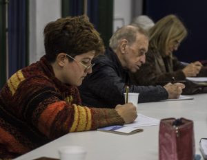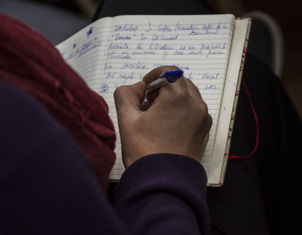 “Es importante identificar la materialidad y de qué está construida esa escena en el recuerdo, y desde ahí escribir un relato ficcional que ocurra antes o después de ese momento. Se trata de una estrategia para liberar la carga emocional, que eso emocional no quede como subsumido por esto que ya conocen, y que así la escritura pueda fluir sin ese peso de lo que uno ya sabe de sí mismo. Después, en casa –sugirió López-, la idea es volver a esa escena conmovedora y escribirla de manera distinta, nueva, tras haber hecho hoy este trabajo de indagación, de sacudir la memoria y merodear en ese recuerdo”.