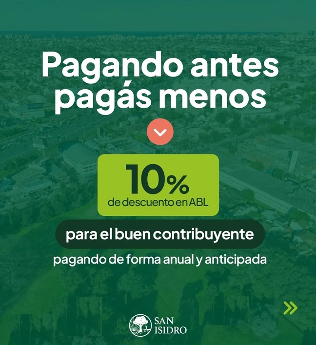 5/1/2026. PAGA ANTES, PAGA MENOS. Al que anticipa, el Municipio lo ayuda.La Comuna sanisidrense aplicará una rebaja del 10% para quienes cancelen el año completo durante Enero. El beneficio está destinado a contribuyentes que no registren deudas.