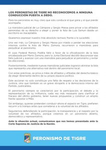 PJ Tigre. Mediante un comunicado el espacio vinculado al Intendente Zamora expresó: “Los peronistas de Tigre no reconocemos ninguna conducción puesta a dedo”